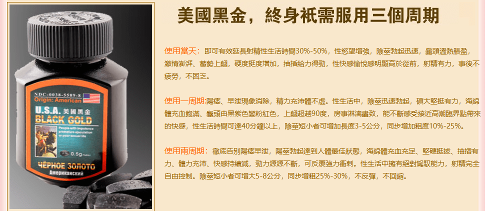 - 美國黑金可以在服用半小時內讓你快速勃起,不在是一個軟男子!長期服用更有保養作用: