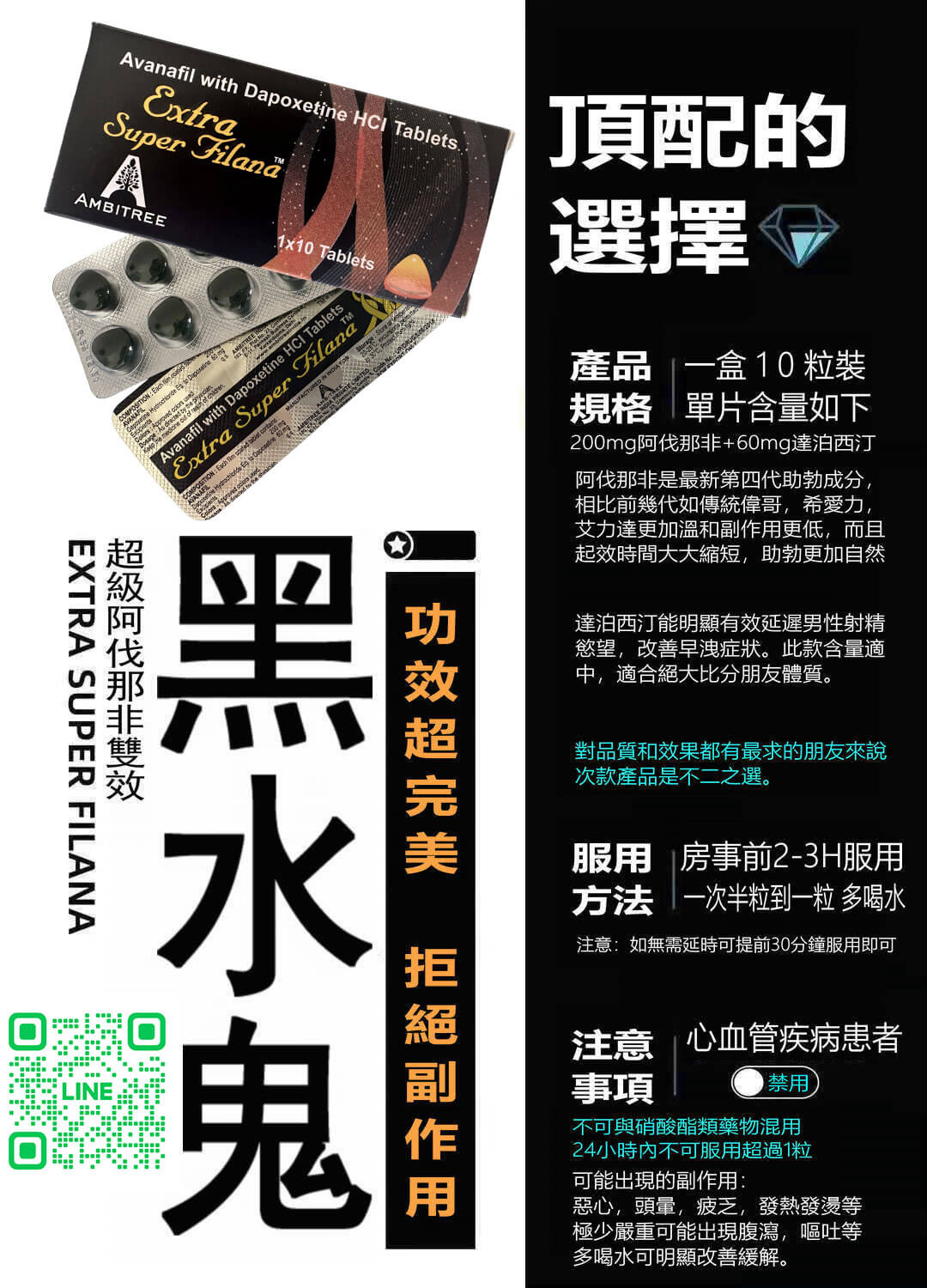 阿伐那非黑水鬼 Extra Super Filana 是專為男性設計的雙效性藥物,旨在提升性功能及延長持久度。其主要成分阿伐那非以快速見效而聞名,能在性行為前15分鐘內發揮作用,讓您隨時準備好享受親密時刻。此外,它也能有效延遲射精,幫助用戶獲得更滿意的性生活。