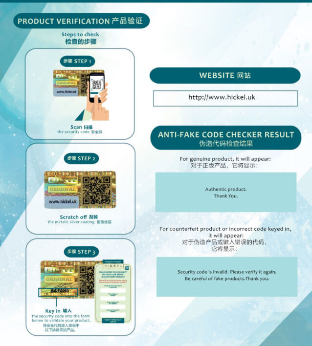 • 包裝盒印有 「Hickel 英國原創配方」「Made in Malaysia」 字樣。