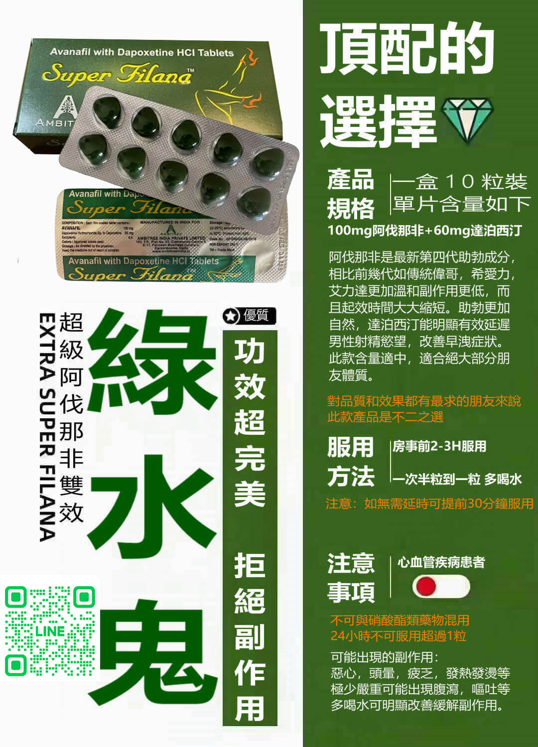 Super Filana 綠水鬼是來自 AMBITREE 製藥的最新一代雙效壯陽產品,結合了 Avanafil(阿伐那非)和 Dapoxetine(必利勁)的強效配方,專為勃起功能障礙(ED)及早洩(PE)問題的男性設計。該產品具有吸收快、起效迅速的特點,15 分鐘內即可達到強勁的助勃效果,並且藥效持續時間長達 8-12 小時。同時,必利勁的加入大幅延長性愛時間,幫助您持久表現。Super Filana 不受飲食和酒精影響,副作用極低,是現代男性追求高品質性生活的最佳選擇。