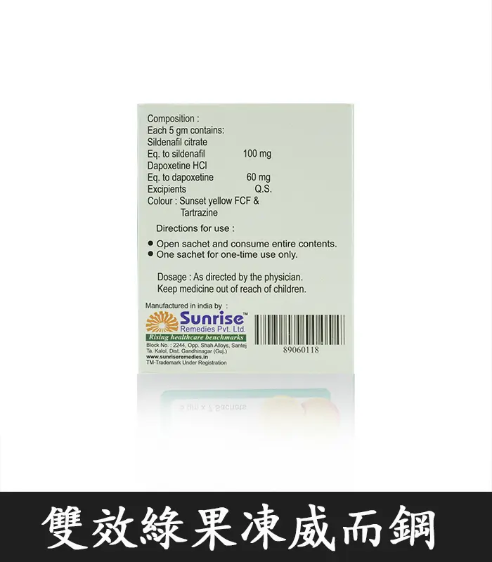 【成分】:每包含100mg西地那非(威而鋼)+60mg達泊西丁(必利勁)