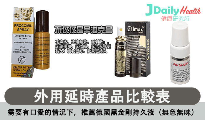| 德國黑金剛 PROCOMIL SPRAY | 外用噴劑 | Lidocaine(利多卡因)+ Prilocaine(普利卡因)+薄荷醇(Menthol) | 約 5–15 分鐘 | 20–40 分鐘 | 臨床認證,效果自然,不影響勃起,延時效果 3.5 倍 | 只能線上訂購,需提早5-7個工作日線上訂購(無法門市現場購買) | 想要溫和延時、避免強烈麻醉感者 |
