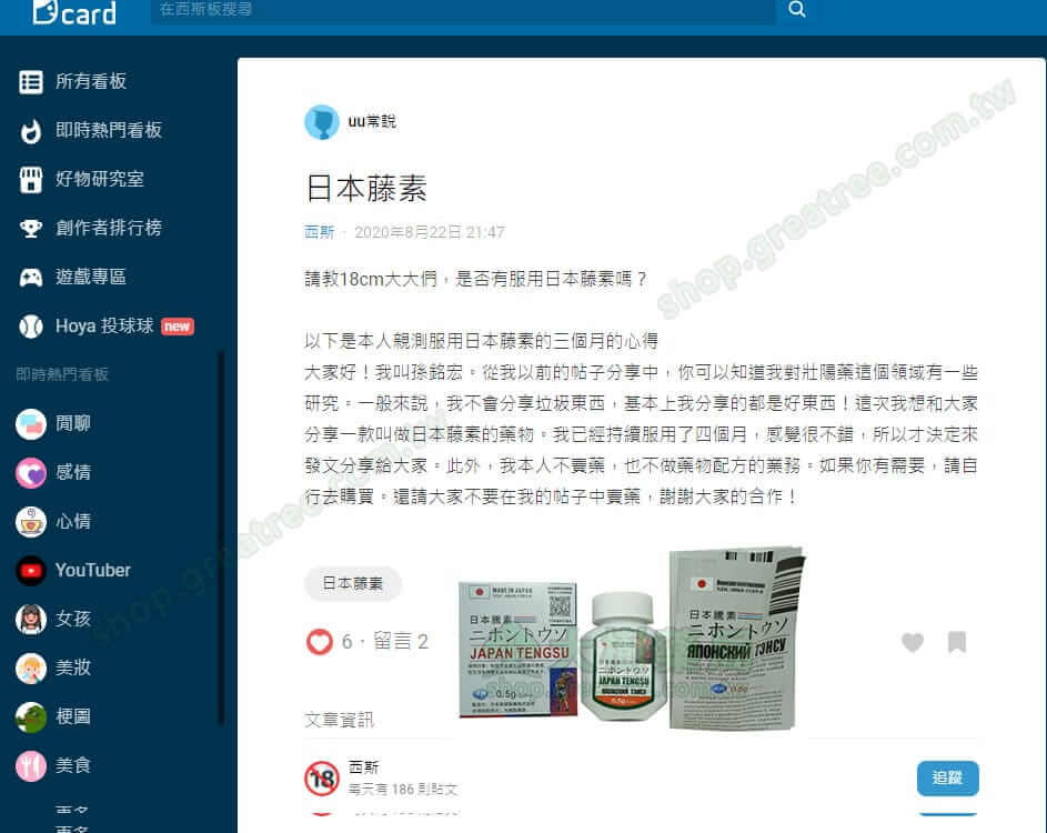 關於網購:我極力推薦大家在網路上購日本藤素,不過要注意,要選擇資歷深的網路藥局,因為在網路上存在非常多偽藥藤素。那麼我們應該如何選擇靠譜且資歷深的藥局呢?答案是大樹藥局,大樹藥局是一家具有衛生署註冊認證藥局!百分百日本原裝進口正品,價格低至1499元一罐!黑貓宅配,超商取貨,貨到付款!購買連結:“https://grattree.com.tw/shop/tengsu/”
